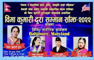 “नेपाल र नेपालीको शान, कला सँस्कृति हाम्रो पहिचान” नारा दिइएको यस कार्यक्रमको तैयारी अन्तिम चरणमा पुगेको कुरा कार्यक्रम सँयोजक सिर्जना बिरही थापा ले बताउनु भएकी छिन । साथै वहाँले यस कार्क्रमलाइ भव्यताका साथ सफल पार्न आर्थिक र भौतिक रुपमा साथ र सहयोग गर्नु हुने सम्पुर्ण महान साहयोगी ब्यक्तिहरुलाइ ह्रदय देखि धन्यबाद दिएकी छिन भने भविष्यमा पनि यस्तै नेपाली कला र सँस्कृति जोगाउने कार्यक्रमहरुलाइ दिल खोलेर सहयोग गर्नु हुनेछ भन्ने आसा पनि राखेकी छिन । आफ्नै जन्मभुमीको डाँडा पाखा पखेरो, देउराली भन्याङ उकाली ओराली र चौतारीको सुगन्ध बोकेको यस कार्यक्रममा उपस्थित भै सर्वकालीन महान गायिका बिमा कुमारी दुरा ज्युको गित सुनेर कैले नाचौ, कैले हाँसौ र कैले भाव विब्हल होऔ भनेर सबै बाल्टिमोरबासी नेपालीहरुलाइ आव्हान पनि गर्नु भएको छ ।